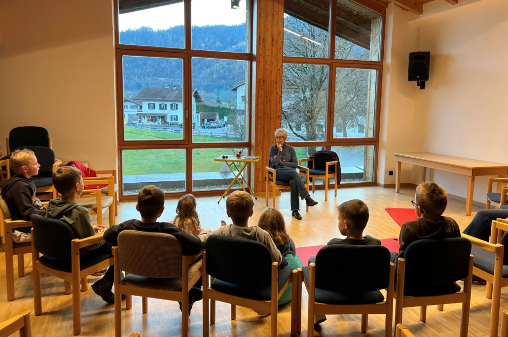 Die Kinder dürfen gerne ein Sitzkissen mitnehmen, wir haben aber auch Yogamatten zum Draufsitzen.