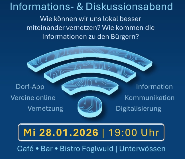 Wir laden euch herzlich ein zum Wössner Bürgerstammtisch „Wössen – Digital & sozial vernetzt“. An diesem Abend wollen wir gemeinsam diskutieren, wie wir uns im Dorf besser digital und sozial miteinander vernetzen können. Bringt eure Ideen und Erfahrungen mit ein und diskutiert mit. Wir freuen uns auf euch!
