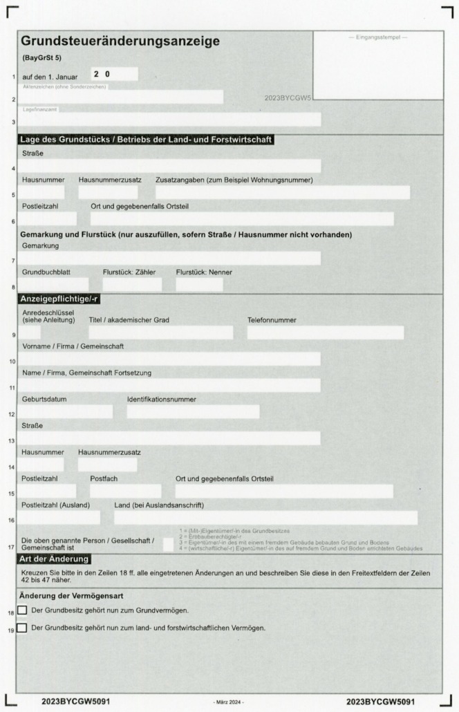 Das Finanzamt Traunstein informiert, daß sich der bayerische Vordruck „Grundsteueränderungsanzeige“ (BayGrSt 5) und die dazugehörige Ausfüllanleitung geändert haben. Diese können unter dem Link http://www.grundsteuer.bayern unter dem Punkt „Anzeigen von Änderungen“ abgerufen werden.