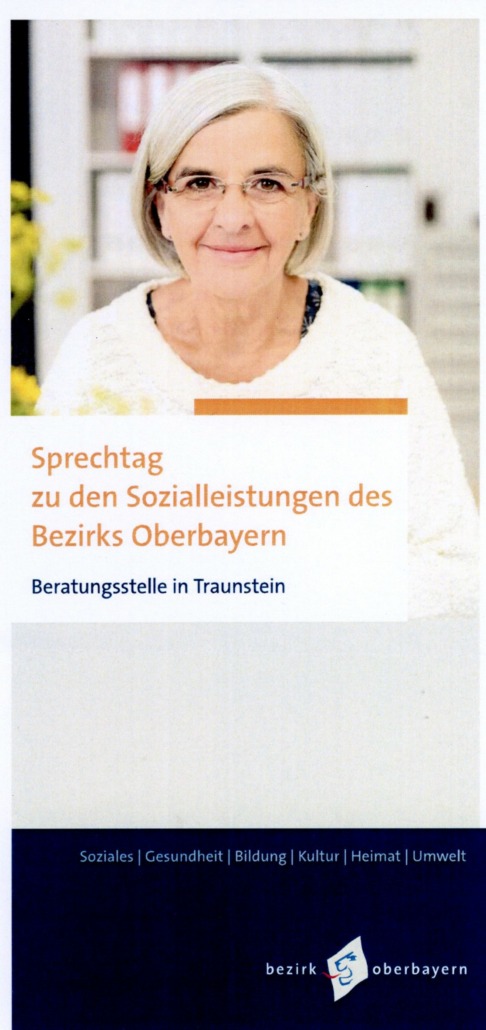 Der Bezirk Oberbayern ist für die Bürgerinnen und Bürger im Landkreis Traunstein wohnortnah erreichbar: Beim wöchentlichen Sprechtag im Pflegestützpunkt beraten wir vertraulich und kompetent zu unseren sozialen Leistungen. Unsere Beratung vor Ort richtet sich an Menschen mit Pflegebedarf und Menschen mit Behinderungen sowie deren Angehörige.