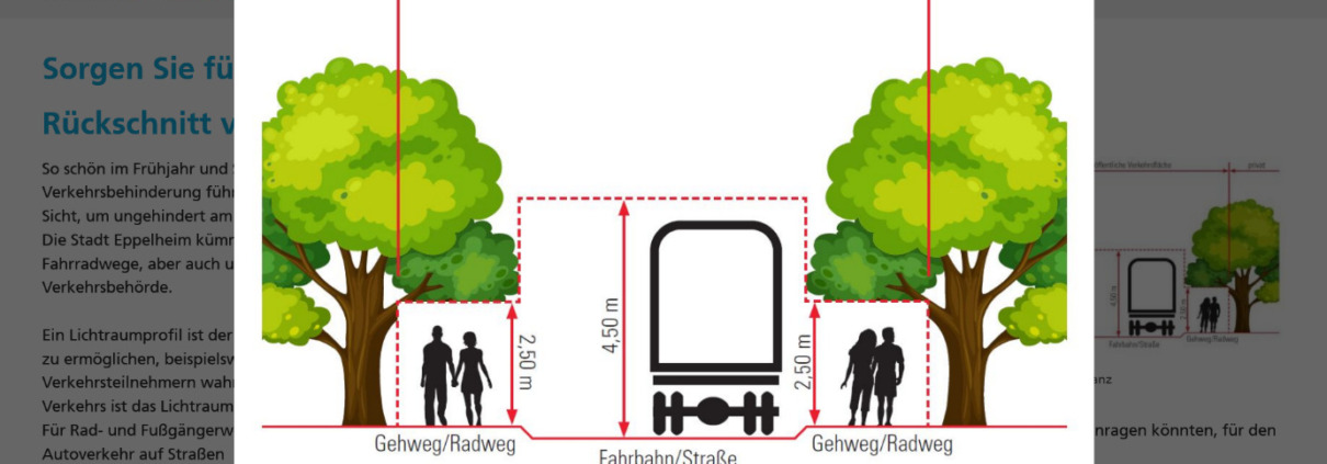 Wir bitten alle Grundstückseigentümer mit Grundstücken an Straßen, Wegen und Plätzen, das Lichtraumprofil für den Straßenverkehr freizuhalten, um Schäden von sich selbst und von anderen abzuwenden. Das Lichtraumprofil ist für Gehwege, Radwege und Fahrbahnen von jeglicher Beeinträchtigung freizuhalten. Darunter fallen auch Bäume und Sträucher, deren Äste in das Lichtraumprofil hineinragen. Die Eigentümer, deren Grundstücke an den Verkehrsraum angrenzen, werden gebeten, den Bewuchs dahingehend zu prüfen.